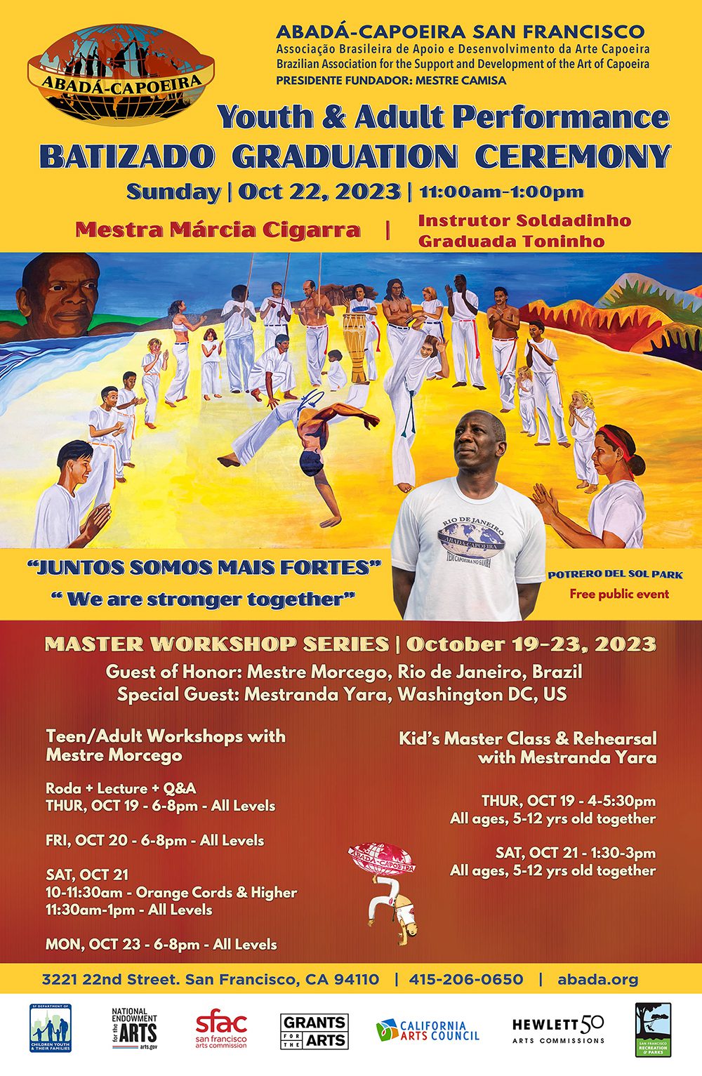 This event brings together our ABADÁ-Capoeira San Francisco kids, teens, and adults. New kid students will receive a Capoeira nickname in class from Instrutor Soldadinho and Graduada Toninho the weeks prior to the Batizado. At graduation, all participants will receive the appropriate new corda level.