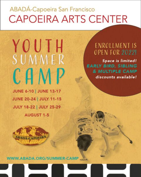Summer Camp is designed for and open to all levels. Classes are taught using games and exercises emphasizing cooperation, leadership, and skill building. During the one-week session, kids learn basic Capoeira and Maculelê techniques, as well as musical rhythms, instruments, and songs in Portuguese. Some days, guest artists will introduce new forms of dance, music, art or educational play. Wednesdays include a walk through the Mission neighborhood to enjoy lunch and outdoor play at Dolores Park. Sessions culminate with a performance for family and friends!