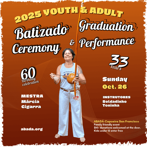 We also invite the entire community to attend the batizado ceremony on Sunday, October 26th, at 1:00 p.m. Experience the graduation ceremony and cultural performance as some of the best capoeira artists showcase their talents. Come and cheer on the youth and adult participants as they receive their new cords.