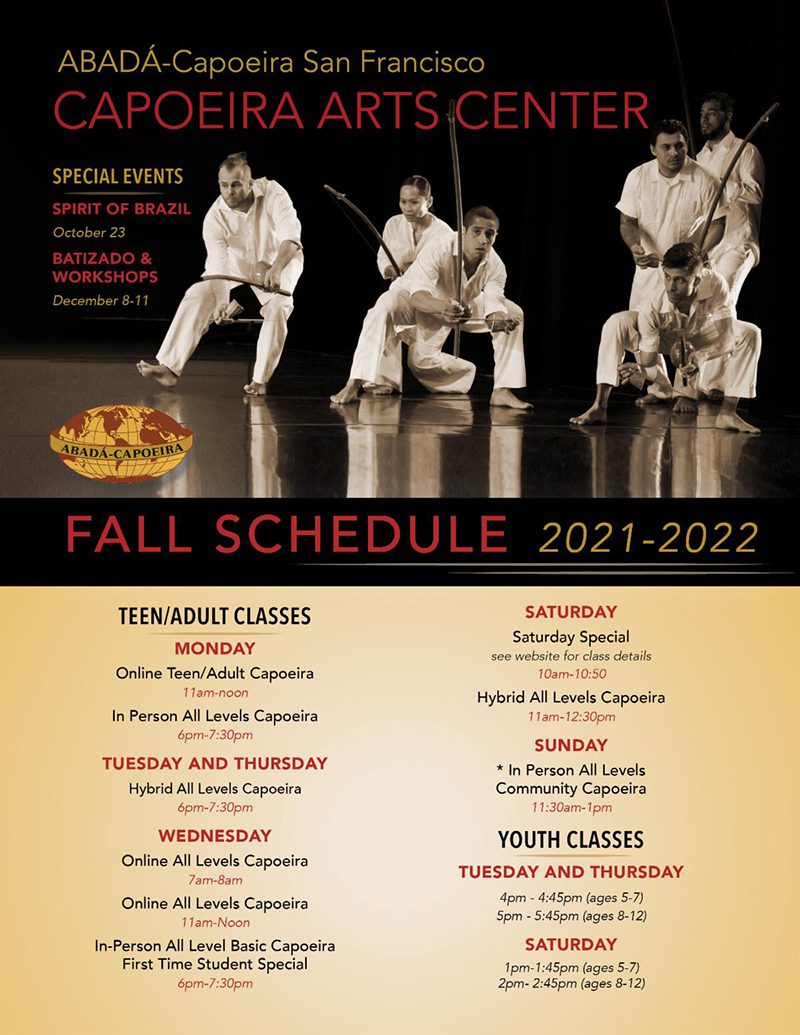 CAPOEIRA FOR YOUTH (5-12 years old) In-Person ONLY Mondays 4pm – 5pm Tuesdays 4pm – 5pm Saturdays 1pm – 2pm…